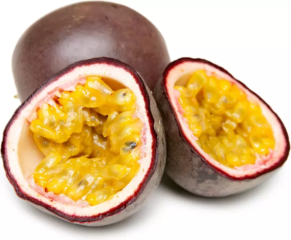 Плоды маракуйи круглой или овальной формы, похожи внешне на крупные сливы, кожура бывает желтого или насыщенного фиолетового цвета. Фрукты вырастают до 30 см в длину и 12 см в ширину, в зависимости от сорта. Кожица очень плотная и защищает внутренность плода от повреждений. Сама мякоть оранжевого цвета, очень ароматная, железообразной консистенции, со множеством семян фиолетового или коричневого цвета. Вкус плодов сладкий с кислинкой.